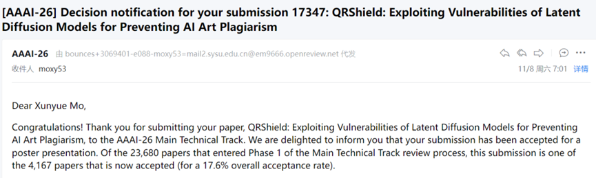 近日,在beat365唯一官方网站吴炜滨副教授指导下,2023级本科生莫勋悦以第一作者身份首次投稿的学术论文“QRShield: Exploiting Vulnerabilities of Latent Diffusion Models for Preventing AI Art Plagiarism”被人工智能领域的国际顶级会议AAAI 2026接收。