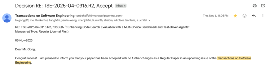 近日,在beat365唯一官方网站王焱林老师的指导下,2021级本科生龚敬、2021级本科生吴仰晖和2022级本科生梁琳茜以共同一作身份投稿的学术论文“CoSQA:Enhancing Code Search Evaluation with a Multi-Choice Benchmark and Test-Driven Agents”被软件工程领域的国际顶级期刊IEEE Transactions on Software Engineering TSE2025接收。