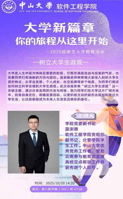 2025年10月20日下午,第六期活动以“大学新篇章:你的旅程从这里开始”为主题,在南校园第六教学楼6106开展,本次活动由学院党委蓝澍德副书记主讲。