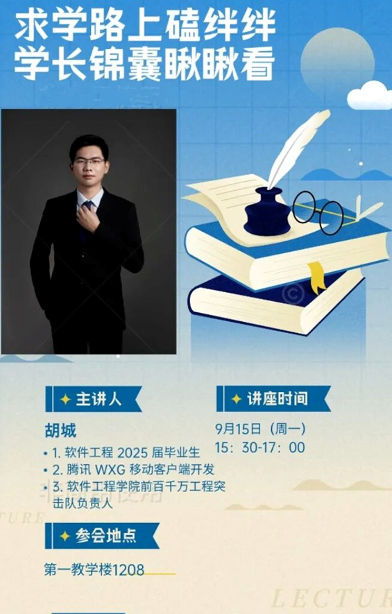 2025915日下午,第二期活动以代码人生:腾讯校友分享软件工程师成长之路为主题,在南校园第一教学楼1208开展。本次活动由学院2025届毕业生、腾讯WXG移动客户端开发工程师胡城校友主讲。