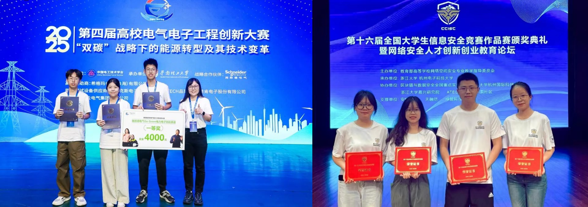 在创赛育人方面,通过专业实践赛道形成AI科技创新创业人才的五种能力和五大思维。以赛促学、以赛促教、以赛促创。以校级科竞协会为平台,以程序设计竞赛、数学建模竞赛、人工智能竞赛、信息安全竞赛、“挑战杯”、“互联网+”等赛事为核心方向,为不同专业方向的学生提供学习资源、技术培训、竞赛组织协调及学科交流支持。截至2025年底,学院学生获省部级及以上竞赛奖项数近350项,包括中国软件服务创新大赛一等奖、中国数字服务大会服务计算创新大赛一等奖、全国大学生信息安全竞赛一等奖、全国大学生“区块链+”应用大赛一等奖、高校电气电子工程创新大赛一等奖、中国可信区块链安全攻防大赛冠军、美国大学生数学建模竞赛F奖(特等奖提名)等。