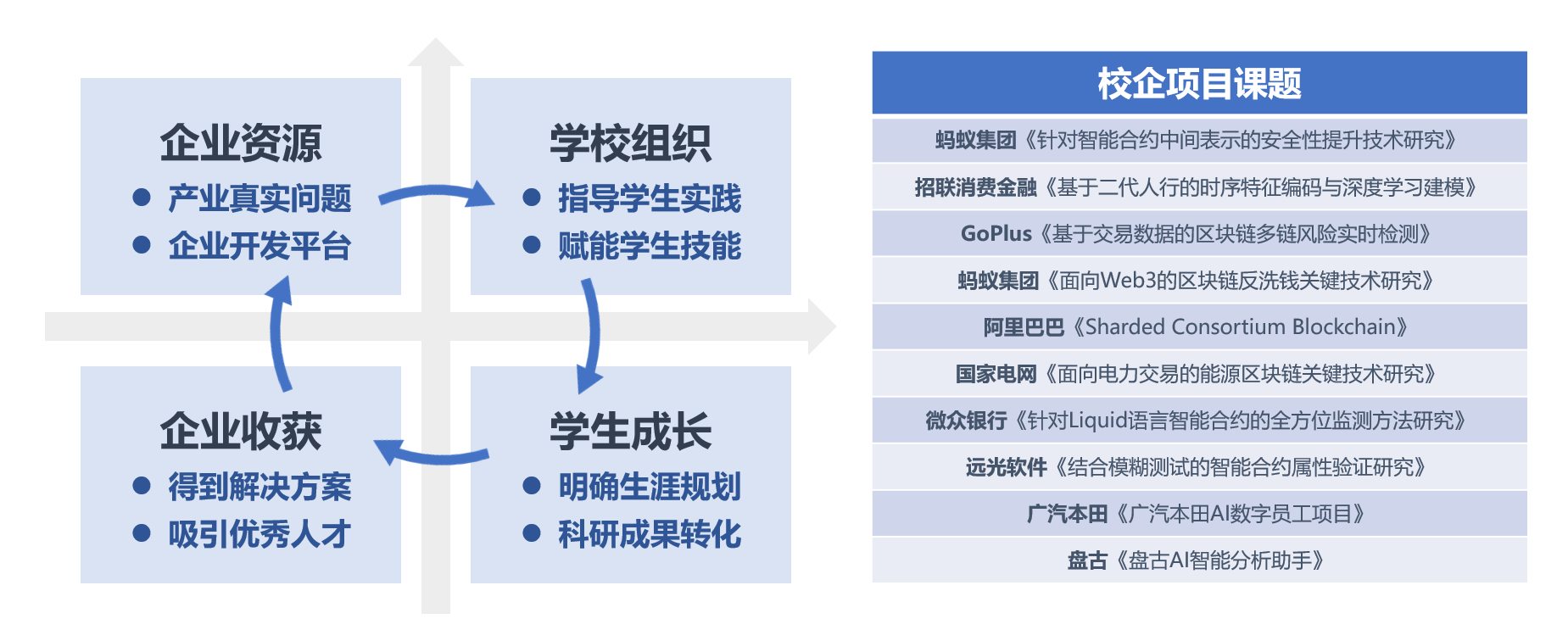 在产教融合方面,通过企业出题的真实化项目,组织指导学生实践,提升学生应用所学的综合能力,在成果产出中明确个人成长目标,为合作企业培育潜在人才,实现产研互促、双向赋能。Blue Hub与业界多家公司建立了密切的合作关系,包括华为、腾讯、微众银行、阿里巴巴、招联金融、南方电网、浪潮、数字广东、东莞盘古信息、粤港澳大湾区国家技术创新中心等,师生协作在区块链、深度学习、智能合约、可信智能体等领域开展了一系列产学研项目。